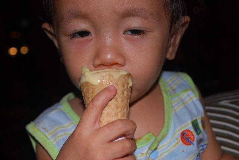 I can’t find his first walk, er, I don’t even remember if I was able to take a shot of that moment. Good thing last night hubby treated us to a pizza dinner. See him? That is his first time to eat on his own. Oh, we had so much laugh watching him. The last photo is him again, first time to have a cone of his own.